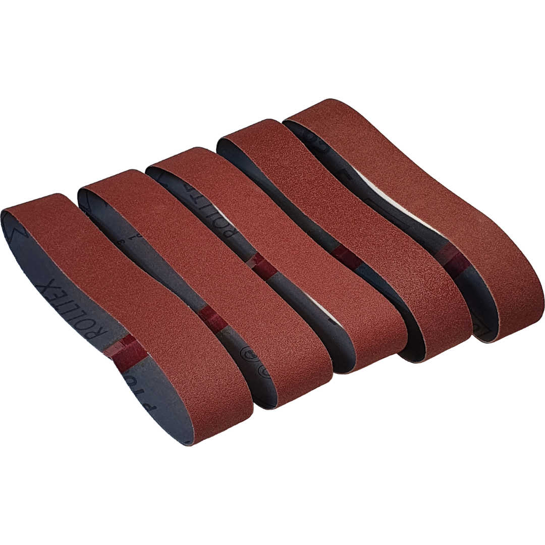 Schleifbänder in verschiedenen Körnungen. Bei dem 5er Bundle ist jeweils ein P80, P120, P150, P240 und P320 enthalten. Bei dem 10er Bundle ist es folgendermaßen: 2x P80, 1x P100, 2x P120, 1x P150, 1x P180, 2x P240, 1x P320
