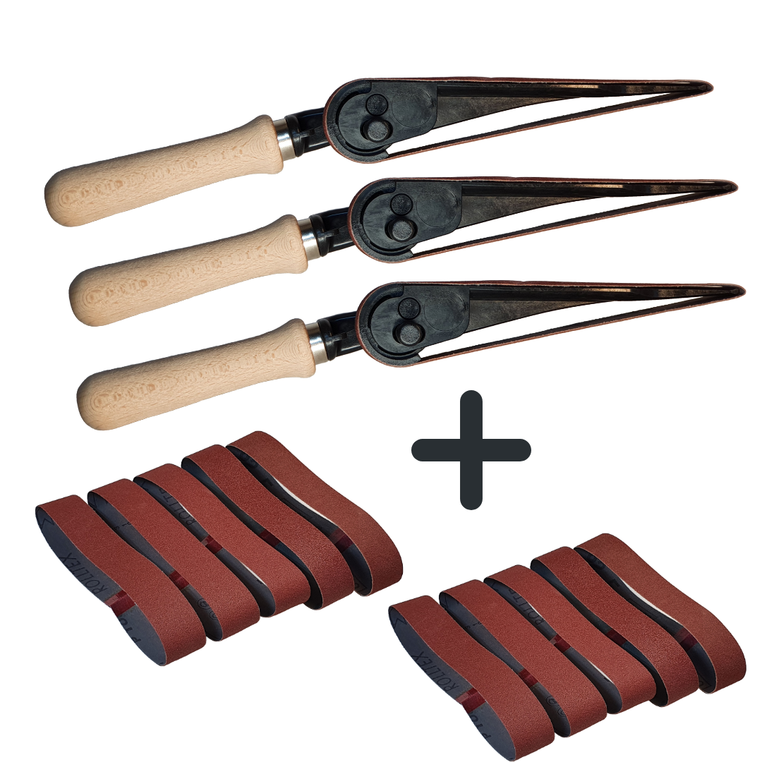 Drei Uni-Foss mit aufgezogenem Schleifband und zusätzlich 10 Schleifbänder.